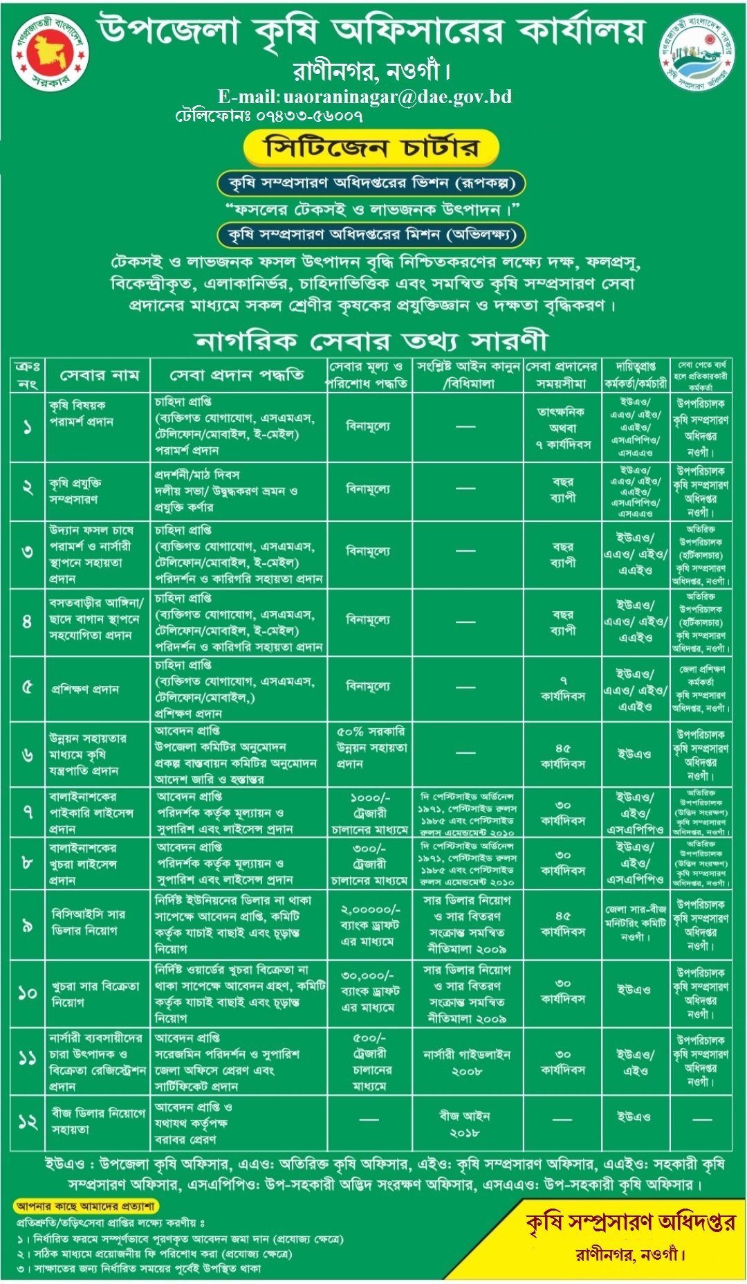 | সিটিজেন চার্টার উপজেলা কৃষি অফিস, রাণীনগর, নওগাঁ।
